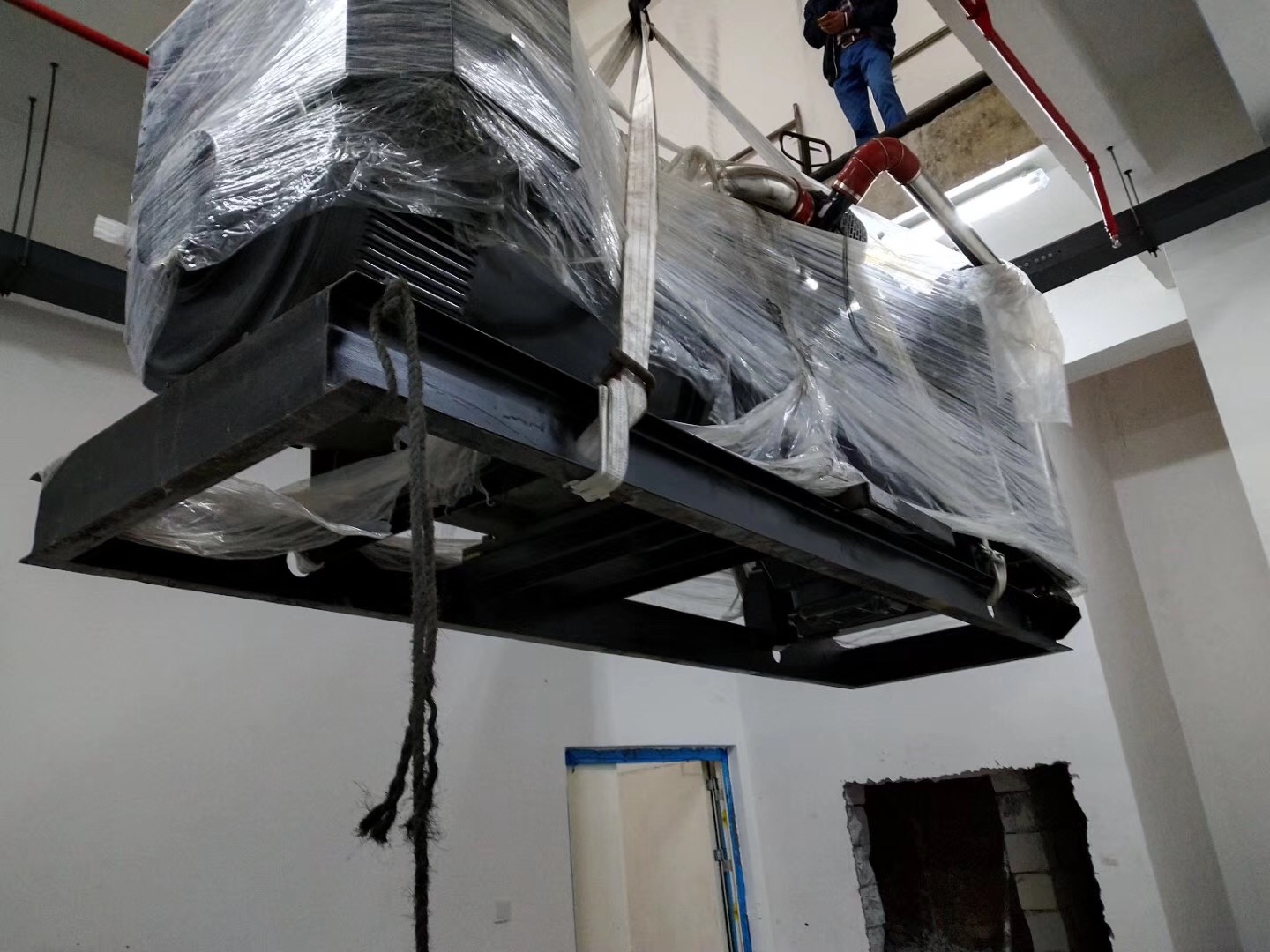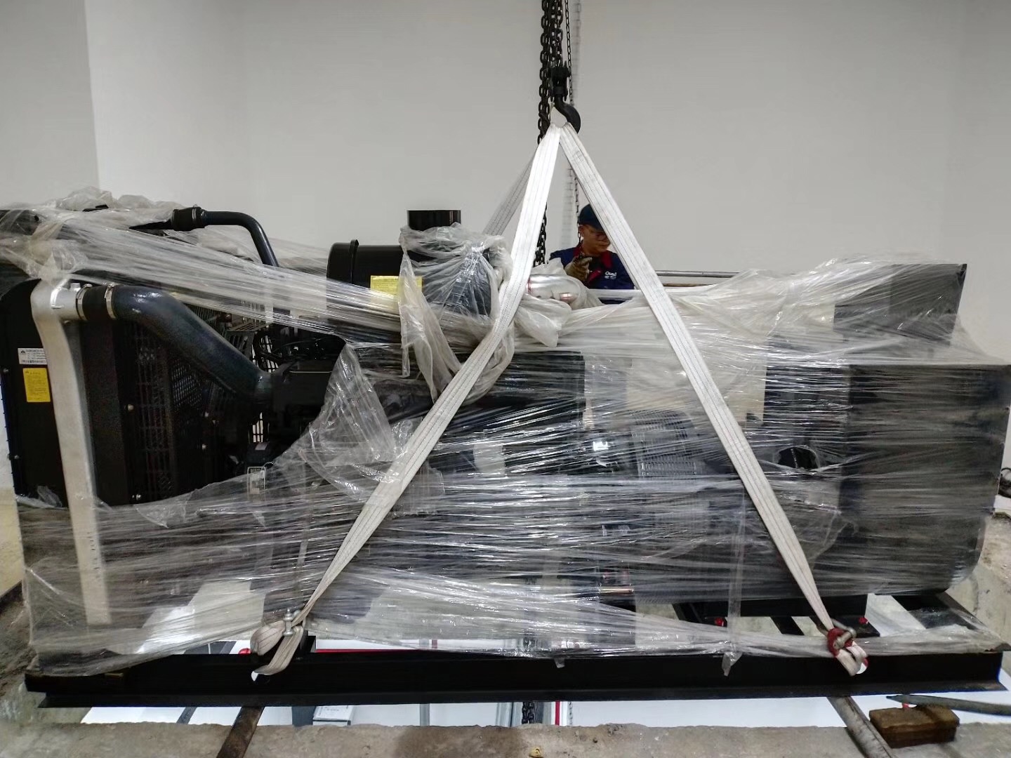 歐蘭德人員負責客戶現(xiàn)場的發(fā)電機吊卸,務必把發(fā)電機完好無損的送至地下室。專業(yè)的團隊做專業(yè)的事情,這都源于客戶對我們的信任,把吊卸這么重要的任務交于我們。